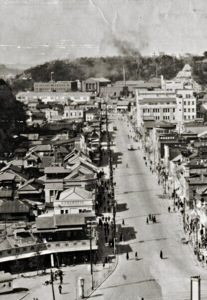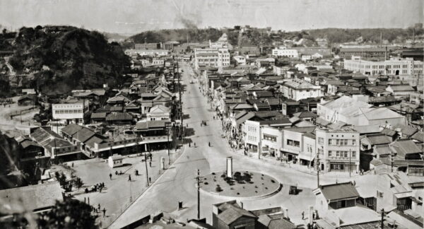 横須賀中央駅周辺から米海軍横須賀基地へ続く繁華街の昔の写真。、左上奥に見えるのが米海軍横須賀基地司令部と在日米海軍司令部の建物(画像:米海軍横須賀基地)。