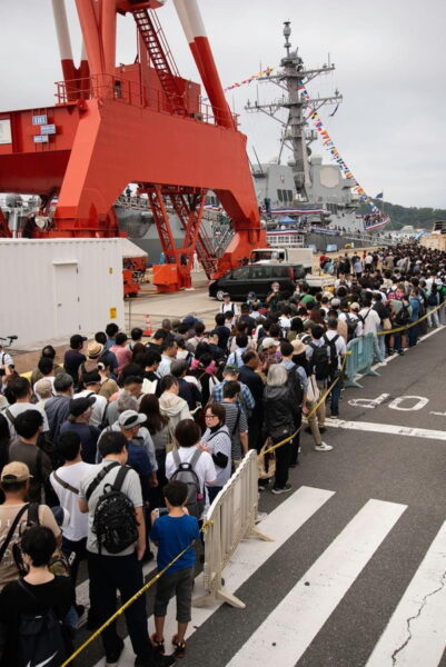 過去に開催された「ヨコスカフレンドシップデー」の来場者列。中央に見える船は、アメリカ海軍台7艦隊の旗艦「ブルーリッジ」(画像:米海軍横須賀基地)。