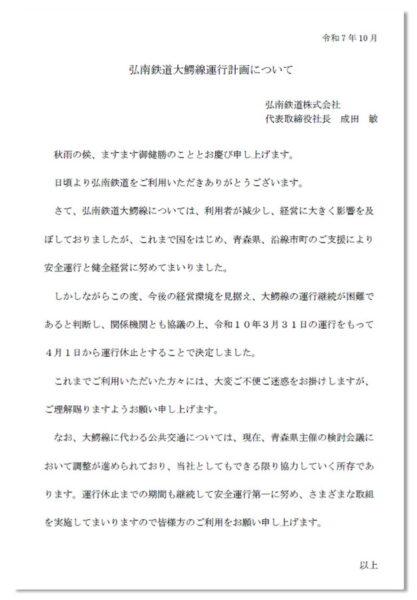 東北のローカル私鉄路線が事実上の廃止へ 弘南鉄道「大鰐線」70年の歴史に幕 代替交通はどうなる? 読み込み中... 拡大画像 弘南鉄道 大鰐線の7000系電車(画像:弘南鉄道) 拡大画像 弘南鉄道 大鰐線の7000系電車改造車(画像:弘南鉄道) 拡大画像 弘南鉄道 大鰐線の7000系電車改造車(画像:弘南鉄道) 拡大画像 弘南鉄道が発表した大鰐線運行停止に関する文書(画像:弘南鉄道株式会社 公式X) 拡大画像 運行休止を発表した弘南鉄道 大鰐線(画像:写真AC) この画像の記事を読む