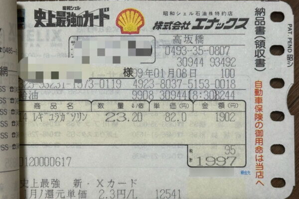 高市氏でガソリン安くなる? きょう「石油の日」 統計上「最安値」「最高値」だったのはいつ? 読み込み中... 拡大画像 1999年1月に発行された実際の給油レシート。レギュラーガソリン1Lの価格は82円となっている(編集部蔵) 拡大画像 ガソリン価格は依然として高値が続いている(画像:写真AC) 拡大画像 ガソリン価格は依然として高値が続いている(画像:写真AC) 拡大画像 ガソリン価格は依然として高値が続いている(画像:写真AC) 拡大画像 ガソリン価格は依然として高値が続いている(画像:写真AC) この画像の記事を読む