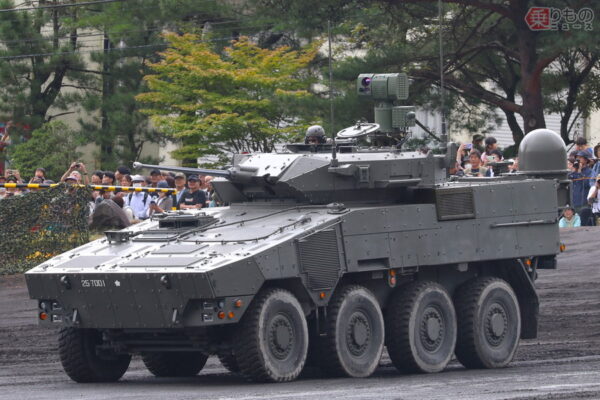 目前を疾走!「新たな日の丸戦闘車両」ポイントは背中の巨大ドーム&伸縮マスト 動画で見せます 読み込み中... 拡大画像 87式偵察警戒車(左手前)と25式偵察警戒車(右奥)。87式偵察警戒車は6輪駆動の車体に25mm機関砲塔を組み合わせているのに対し、25式偵察警戒車は8輪駆動の車体に30mm機関砲塔を搭載している(乗りものニュース編集部撮影)。 拡大画像 陸上自衛隊の新装備である25式偵察警戒車。従来「共通戦術装輪車(偵察戦闘型)」と呼ばれていた(乗りものニュース編集部撮影)。 拡大画像 陸上自衛隊の新装備である25式偵察警戒車。従来「共通戦術装輪車(偵察戦闘型)」と呼ばれていた(乗りものニュース編集部撮影)。 拡大画像 陸上自衛隊の新装備である25式偵察警戒車。従来「共通戦術装輪車(偵察戦闘型)」と呼ばれていた(乗りものニュース編集部撮影)。 拡大画像 陸上自衛隊の新装備である25式偵察警戒車。主武装は30mm機関砲で、福武装として7.62mm機関銃も装備している(乗りものニュース編集部撮影)。 拡大画像 陸上自衛隊の新装備である25式偵察警戒車。車体の主要コンポーネントは16式機動戦闘車と共用している(乗りものニュース編集部撮影)。 拡大画像 陸上自衛隊の新装備である25式偵察警戒車。足回りは8輪駆動(乗りものニュース編集部撮影)。 拡大画像 25式偵察警戒車の後ろ姿(乗りものニュース編集部撮影)。 拡大画像 陸上自衛隊の新装備である25式偵察警戒車。従来「共通戦術装輪車(偵察戦闘型)」と呼ばれていた(乗りものニュース編集部撮影)。 この画像の記事を読む