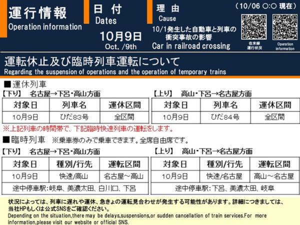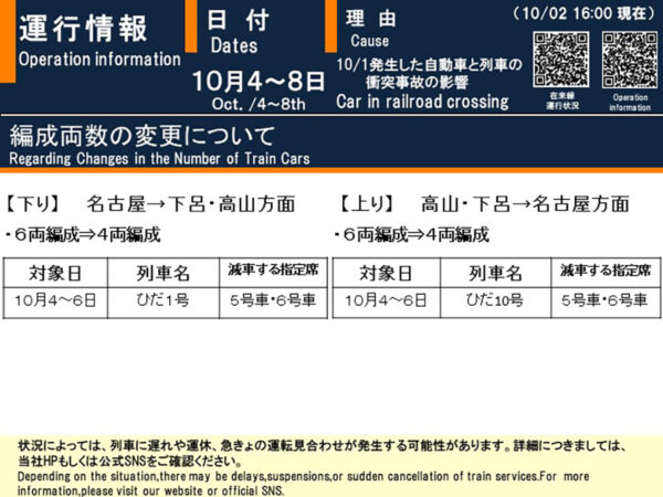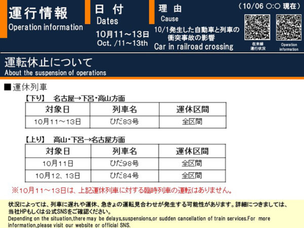 事故で破損の「最新ハイブリッド特急」影響深刻 代打で「臨時快速」運転 3連休前の平日に 読み込み中... 拡大画像 10月9日の運行について(画像:JR東海) 拡大画像 10月11~13日の運行について(画像:JR東海) 拡大画像 8日までは一部編成を減車(画像:JR東海) 臨時快速はキハ75系ではないかとファンが予測している。写真は快速みえ(画像:写真AC) HC85系。一部車両がキャリアカーとの事故で破損した(乗りものニュース編集部撮影) この画像の記事を読む