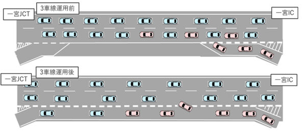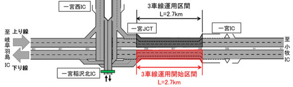 先頭で合流、やっぱ“ズルい”? 「ファスナー合流」の理想と現実 立役者の区間は“どこでも合流”可能に 読み込み中... 「ファスナー合流大作戦」が行われた名神の一宮IC、一宮JCTの位置(画像:NEXCO中日本)。 NEXCO中日本が行った「ファスナー合流大作戦」(画像:NEXCO中日本)。 渋滞による損失時間は3割減(画像:NEXCO中日本)。 渋滞件数と交通量(画像:NEXCO中日本)。 ファスナー合流の効果。加速車線の手前で合流(左)すると加速が十分でないため、本線を走るクルマにブレーキを踏ませてしまうことがある(画像:名古屋高速道路公社)。 下り線、一宮IC合流部の状況(画像:NEXCO中日本)。 拡大画像 片側3車線化の概要(画像:NEXCO中日本)。 拡大画像 片側3車線化の概要(画像:NEXCO中日本)。 「ファスナー合流大作戦」が始まった2019年の名神上り線、一宮JCT合流部。ラバーポールが連続して設置されている(乗りものニュース編集部撮影)。 拡大画像 まもなく片側3車線化される名神下り線、一宮ICー一宮JCT間。上り線は3車線になっている(乗りものニュース編集部撮影) この画像の記事を読む