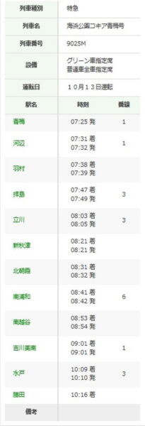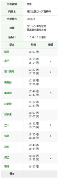 「多摩エリアと茨城を結ぶ特急」が3連休に運転! “青梅線から常磐線まで”直通 豪華グリーン車も 読み込み中... 拡大画像 臨時特急「海浜公園コキア青梅号」運行時刻(画像:JR東日本) 拡大画像 臨時特急「海浜公園コキア青梅号」運行時刻(画像:JR東日本) 拡大画像 勝田車両センターに配置されているE653系(画像:写真AC) この画像の記事を読む
