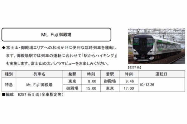 「東京駅と御殿場駅を結ぶJR特急」がいよいよ運転! 品川駅と横浜駅にも停車 富士エリアへ乗り換えなし 読み込み中... 拡大画像 特急「Mt.Fuji御殿場」の運行時刻(画像:JR東日本) 拡大画像 E257系電車(画像:写真AC) この画像の記事を読む
