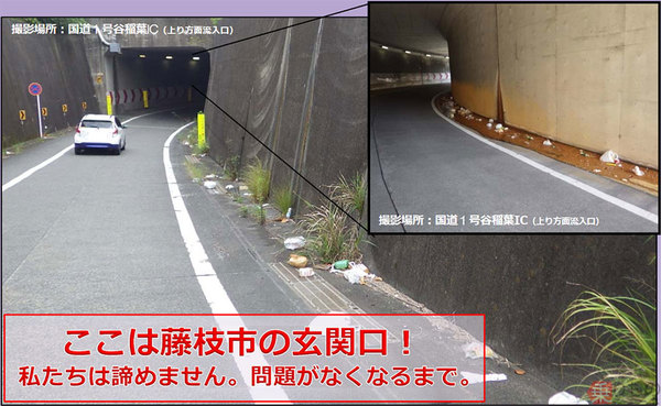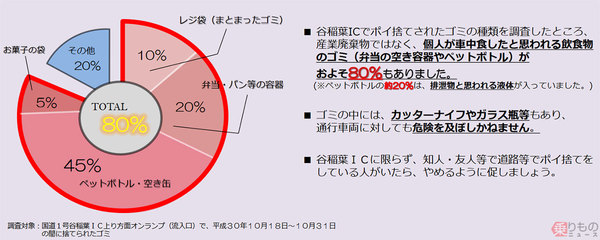 「ゴミがゴミを呼ぶ」幹線道路沿いのゴミ銀座 そこで「ゴミを捨てる」ドライバーの心理とは? 「不満のはけ口」の可能性も 読み込み中... 国道1号バイパス谷稲葉IC(静岡県藤枝市)のゴミ(画像:静岡国道事務所) 2018年調査では捨てられていたペットボトルの20%が排泄物入りと思われる液体入りだったという(画像:静岡国道事務所) 国道298号のポイ捨て対策(画像:北首都国道事務所) 国道298号のポイ捨て対策(画像:北首都国道事務所) ポイ捨てで悪名高い国道357号の川崎市東扇島地区。駐車対策もむなしくゴミが散乱(ドライブレコーダー) 運転席側ばかりゴミが捨てられている幹線道路の例(乗りものニュース編集部撮影) 拡大画像 高規格道路沿いで見つけた看板。そのものズバリを訴えている(乗りものニュース編集部撮影) 右側の金網は不法投棄対策。それでもゴミが捨てられる(ドライブレコーダー) この画像の記事を読む