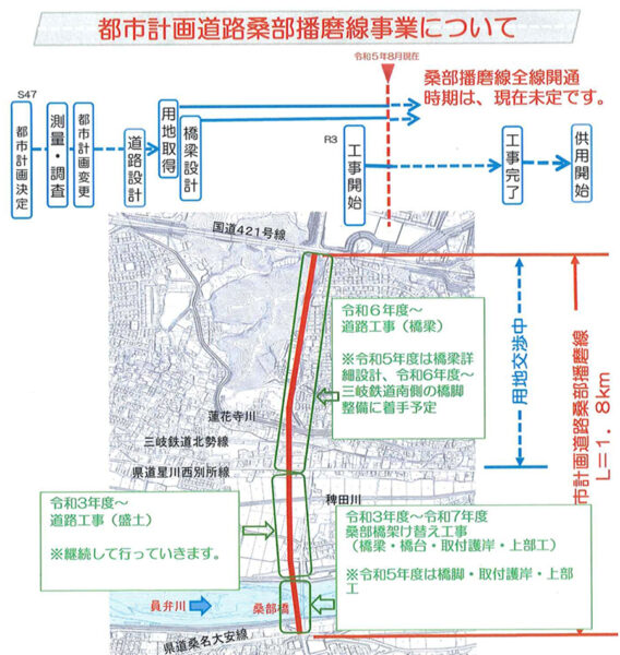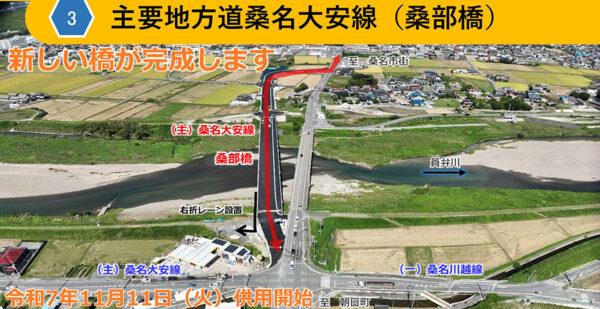 激混み国道1号&23号回避ルートを「桑名まで延ばす」!? 大河を渡る新しい橋が先行開通! ボトルネック解消へ 三重 読み込み中... 拡大画像 開通する新・桑部橋について(画像:三重県)。 拡大画像 開通する新・桑部橋について(画像:三重県)。 拡大画像 開通する新・桑部橋について(画像:三重県)。 拡大画像 開通する新・桑部橋について(画像:三重県)。 拡大画像 開通する新・桑部橋について(画像:三重県)。 拡大画像 国交省のライブカメラに映る新・桑部橋(画像:国土交通省)。 拡大画像 都市計画道路「桑部播磨線」について(画像:三重県)。 拡大画像 北勢バイパスから桑辺橋・桑部播磨線(点線は未開通)に至るルート。東名阪道や国道258号に出るのも容易に(国土地理院の地図を加工)。 拡大画像 中央が建設中の新・桑部橋。員弁川に架かる(画像:Google earth)。 この画像の記事を読む