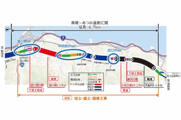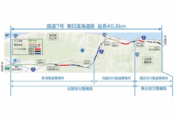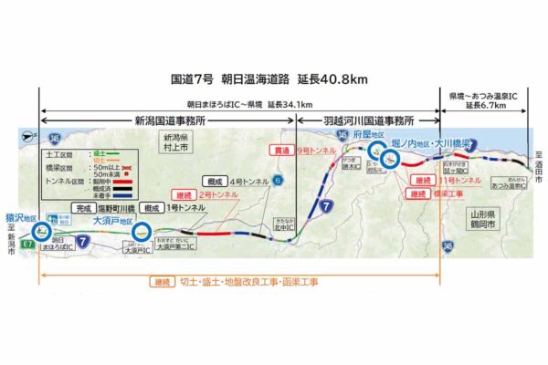 日本海東北道「県境の難所工事」どこまで進んだ? 未開通40kmをトンネル21本でつなぐ「朝日温海道路」 読み込み中... 拡大画像 日本海東北道(朝日温海道路)の計画ルート(画像:国土交通省北陸地方整備局新潟国道事務所) 日本海東北道(朝日温海道路)の標準断面図(画像:国土交通省北陸地方整備局新潟国道事務所) 拡大画像 日本海東北道(朝日温海道路)の現況(画像:国土交通省北陸地方整備局新潟国道事務所) 拡大画像 日本海東北道(朝日温海道路)の現況(画像:国土交通省北陸地方整備局新潟国道事務所) 日本海東北道の現在の終点・朝日まほろばICから先で朝日温海道路の建設が進んでいる(画像:国土交通省北陸地方整備局新潟国道事務所) この画像の記事を読む