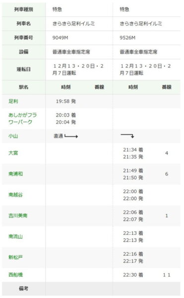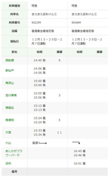 「西船橋」発着の特急列車が冬に運転へ千葉県と栃木県を直結! 新松戸や南流山にも停車 読み込み中... 拡大画像 特急「きらきら足利イルミ」運行時刻(画像:JR東日本) 拡大画像 特急「きらきら足利イルミ」運行時刻(画像:JR東日本) 拡大画像 E257系(画像:写真AC) この画像の記事を読む