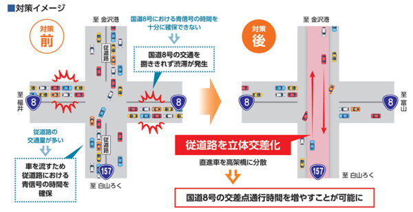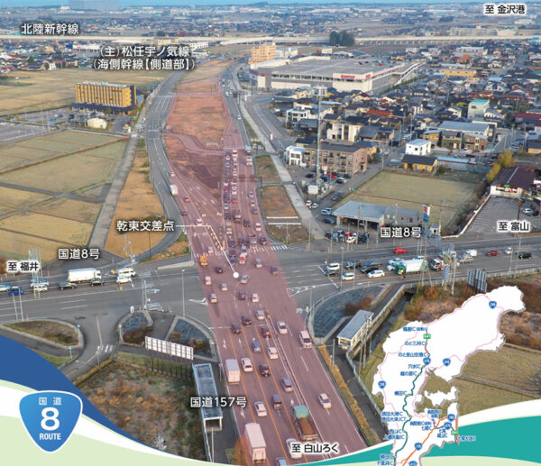 これで国道8号「県内ほぼ“4車線化or立体化”」実現! 市街地の“現道拡幅”まもなく完成 隣の区間は「まるで高速」そうならなかったワケ