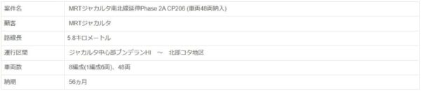 日本車両がインドネシアで鉄道車両を受注!MRTジャカルタ南北線の延伸区間用 読み込み中... 拡大画像 路線計画(画像:日本車両) 拡大画像 新車両の納入概要(画像:日本車両) 拡大画像 フェーズ1で納入した車両、フェーズ2でも同様の車両を納入する予定(画像:日本車両) この画像の記事を読む