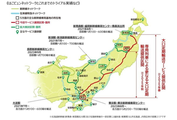 「座席が無い新幹線」来年度に運行開始へ 「やまびこ」の後ろに連結して盛岡と東京を直結! 荷物輸送専用 読み込み中... 拡大画像 E3系「荷物輸送専用車両」の車内(画像:JR東日本) 拡大画像 「はこびゅん」ネットワークとこれまでのトライアル実績(画像:JR東日本) 拡大画像 JR東日本はE3系新幹線1編成を使い、荷物輸送の専用編成を走らせる(画像:写真AC) 関連記事 買っても売ってもお得! バイク王の一大決算セール開催中!! (PR)バイク王 あおなみ線の「座席」が大変化! クッション性を高めた“新デザイン”に順次リニューアルへ 完了はいつ? 【アンケート】鉄道の「乗り換えやすい駅」「乗り換えにくい駅」はどこですか? 名物「県営の渡し船」廃止への布石!? “運航をやめてみる”社会実験 「鉄道と道路の代わり」の船、代替は 武蔵野線の「最閑散駅」に巨大店舗が開業へ “次世代型ホームセンター”誘致で駅利用者も増加!? この画像の記事を読む