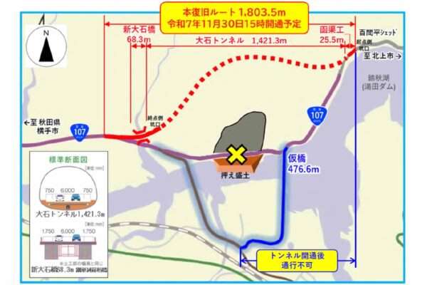国道の「1.4kmトンネル」11月末開通 被災4年半でついに本復旧 仮橋ルートは閉鎖へ 読み込み中... 拡大画像 2025年7月に貫通した国道107号大石トンネル(画像:国土交通省北上川ダム統合管理事務所) 西和賀側トンネル坑口付近(画像:岩手県) 拡大画像 通り初め(画像:岩手県) 拡大画像 国道107号本復旧ルートの概要(画像:岩手県) 国道107号大石トンネルの北上市側坑口。2025年10月撮影(画像:岩手県) 国道107号大石トンネルの西和賀町側坑口。2025年10月撮影(画像:岩手県) 関連記事 買っても売ってもお得! バイク王の一大決算セール開催中!! (PR)バイク王 高速道路上の「非常電話」さらに廃止へ 東北全域に範囲拡大 非常時に「使えない!」注意 【アンケート】鉄道の「乗り換えやすい駅」「乗り換えにくい駅」はどこですか? 国道4号「12.2kmの4車線化」43年越しの完了! 東北道ICまでスムーズに 12月全線開通 岩手 山陽道-岡山市街に“中心部完全スルー”の新ルートまもなく完成! 延伸する南北バイパス、どこまで延びる?どこまで進んだ? この画像の記事を読む