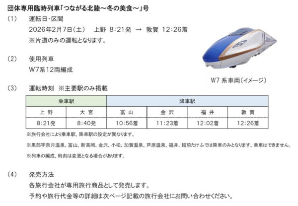北陸新幹線で「所要4時間超え列車」が運行へ 珍しい“上野始発”で敦賀まで直通! 今冬に片道だけ 読み込み中... 拡大画像 団体臨時列車「つながる北陸~冬の美食~」号の運行時刻(画像:JR東日本) 拡大画像 北陸新幹線の車両(画像:写真AC) 関連記事 買っても売ってもお得! バイク王の一大決算セール開催中!! (PR)バイク王 大阪・名古屋と伊勢を結ぶ「夜行特急」が運転へ 私鉄屈指の豪華車両で各3往復 一部は「大阪上本町行き」に 【アンケート】鉄道の「乗り換えやすい駅」「乗り換えにくい駅」はどこですか? あおなみ線の「座席」が大変化! クッション性を高めた“新デザイン”に順次リニューアルへ 完了はいつ? 「座席が無い新幹線」来年度に運行開始へ 「やまびこ」の後ろに連結して盛岡と東京を直結! 荷物輸送専用 この画像の記事を読む