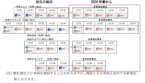 北海道内の特急から「自由席」消滅へ 来年春から全車指定席に “不公平感”解消目指す 読み込み中... 拡大画像 2026年春からの特急列車の編成(画像:北海道) 拡大画像 札幌~旭川間で運行されている特急「カムイ」(画像:写真AC) 関連記事 買っても売ってもお得! バイク王の一大決算セール開催中!! (PR)バイク王 ロシア軍の“長大な輸送路”ウクライナ軍の特殊作戦により爆破 炎上する映像が公開される 【アンケート】鉄道の「乗り換えやすい駅」「乗り換えにくい駅」はどこですか? 韓国に「東京駅に激似の駅舎」が実在!? その正体は… なぜここまで似ちゃったのか その背景とは 伝説の「白いロマンスカー」展示が決定! “先頭車1両”を残して全車解体へ 終の住処は? この画像の記事を読む