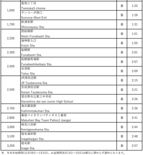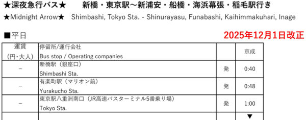 千葉県民の“終電後のアシ”復活&再編! 京成の「深夜急行バス」ルート大幅変更! 船橋/津田沼/内房も帰れます!? 読み込み中... 拡大画像 再編された「新橋・有楽町・東京~新浦安・船橋・津田沼・稲毛線」の乗車バス停(画像:京成バス)。 拡大画像 再編された「新橋・有楽町・東京~新浦安・船橋・津田沼・稲毛線」の降車バス停(画像:京成バス)。 拡大画像 東京君津線の深夜便「アクアスター号」について(画像:京成バス)。 拡大画像 京成バスの深夜急行バス。始発は新橋(画像:京成バス)。 拡大画像 京成バスの深夜急行バス。始発は新橋(画像:京成バス)。 関連記事 抽選じゃない! 宮ヶ瀬クリスマスに400人が無料招待されるぞ! (PR)バイク王 現役最古参の路線バス「やっぱ廃車しません!」 社長の“鶴の一声”発動!? 一転して保存・活用へ 関東自動車 小田急「ロマンスカー」歴代の“人気車種”は? なぜ「行徳」を目指した!? 徳川家康が真っ先に切り開いた“軍事ルート”とは 鉄道に駆逐された「川の街道」 【無料セミナー】「自動車DXサミット vol.4」申込受付中! (PR)アイティメディア/メディア・ヴァーグ この画像の記事を読む
