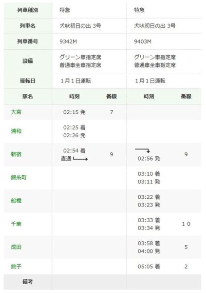 「埼玉県と千葉県を結ぶ夜行特急」が運行へ 大宮から銚子まで直通! 新宿にも停車 読み込み中... 拡大画像 臨時特急「犬吠初日の出3号」の運転時刻(画像:JR東日本) 拡大画像 E257系(画像:写真AC) 関連記事 抽選じゃない! 宮ヶ瀬クリスマスに400人が無料招待されるぞ! (PR)バイク王 創業から74年!? 秋葉原の老舗書店が歴史に幕 一坪のスペースに立ち続けた店主の思いは? 【アンケート】終電を寝過ごした!そのときどうした!? これがホントに引退した車両!? 「短命の名車」が廃車前に美しい姿を披露 “粋なイベント”で最後の花道飾る 【無料セミナー】「自動車DXサミット vol.4」申込受付中! (PR)アイティメディア/メディア・ヴァーグ この画像の記事を読む