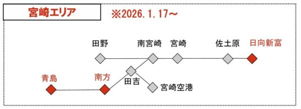 宮崎で「SUGOCA」エリアが拡大! 来年1月から日南線など計7駅で利用可能に JR九州 読み込み中... 拡大画像 エリア拡大対象駅(画像:JR九州) 拡大画像 SUGOCA利用可能エリア・エリア拡大後の「宮崎エリア」(画像:JR九州) 拡大画像 SUGOCA利用可能エリア「福岡・佐賀・長崎・大分・熊本エリア」(画像:JR九州) 拡大画像 SUGOCA利用可能エリア・「鹿児島エリア」(画像:JR九州) 拡大画像 日南線(乗りものニュース編集部撮影) 関連記事 抽選じゃない! 宮ヶ瀬クリスマスに400人が無料招待されるぞ! (PR)バイク王 中央線の「夜行特急」が今月に運転! 想定されるニーズは?初めて「冬の臨時列車」として設定 【アンケート】終電を寝過ごした!そのときどうした!? 「ほぼロングシート」の新型車両が来年6月デビュー! 車内の床は木目調に 国鉄型気動車を順次置き換え JR四国 【無料セミナー】「自動車DXサミット vol.4」申込受付中! (PR)アイティメディア/メディア・ヴァーグ この画像の記事を読む