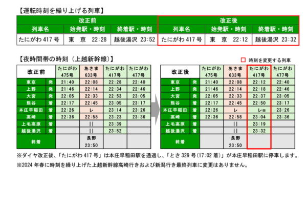 上越新幹線「終電繰り上げ」決定! 保守時間を確保のため 影響はまさかの埼玉県民にも 読み込み中... 拡大画像 2026年3月のダイヤ改正で影響が出る上越新幹線の最終列車の時刻(画像:JR東日本)。 拡大画像 上越新幹線(画像:写真AC)。 関連記事 「宮ヶ瀬」がさらにライダーの聖地に! 官民プロジェクト始動 (PR)バイク王 特急リバティに「寝過ごし注意の駅」始発が誕生へ! 利便性アップ狙って6両編成の拡大も 【見逃し配信中!】「自動車DXサミット vol.4」 (PR)アイティメディア/メディア・ヴァーグ 中央線「懐かしの通勤電車」展示が決定! 青梅鉄道公園のリニューアル概要が明らかに 寝台特急「サンライズ出雲・瀬戸」の時刻が大幅変更! その背景は? 3月ダイヤ改正 この画像の記事を読む 【特集】大変化!?「2026年3月ダイヤ改正」気になる鉄道の改正情報を一括チェック!