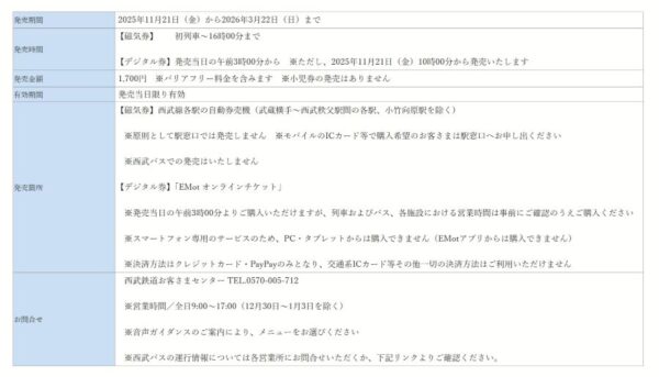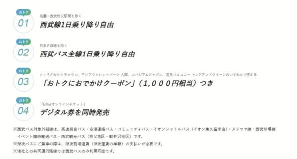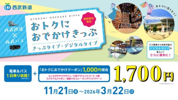 西武線で「超お得なきっぷ」が販売中 バスも乗り降り自由で1000円分のクーポン付き 来年3月まで