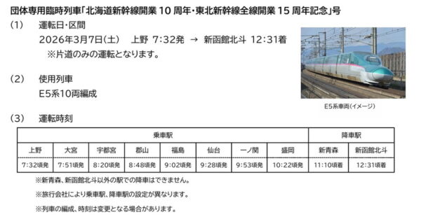 上野から北海道まで「5時間かけて走る新幹線」が運行へ 「はやぶさ」通過駅の宇都宮や福島にも停車 読み込み中... 拡大画像 「北海道新幹線開業10周年・東北新幹線全線開業15周年記念」号の運行時刻(画像:JR東日本) 拡大画像 東北新幹線(画像:写真AC) 関連記事 「宮ヶ瀬」がさらにライダーの聖地に! 官民プロジェクト始動 (PR)バイク王 「立川の次は成田に停まります」多摩エリアと千葉県を結ぶ特急が運行へ グリーン車を連結した9両編成で 【見逃し配信中!】「自動車DXサミット vol.4」 (PR)アイティメディア/メディア・ヴァーグ 山手線より半世紀も早かった! 日本初の「列車の自動運転」は東京じゃなかった!? その驚きの仕組み 「ザ・北海道の鈍行」もう風前の灯火!? 残りはみーんな色違い “キハ40ガチャ”今だけ!? この画像の記事を読む