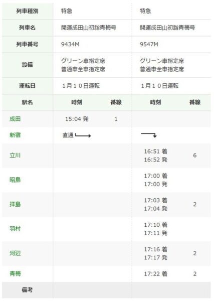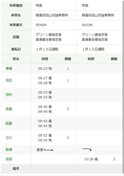 「立川の次は成田に停まります」多摩エリアと千葉県を結ぶ特急が運行へ グリーン車を連結した9両編成で 読み込み中... 拡大画像 臨時特急「開運成田山初詣青梅号」の運行時刻(画像:JR東日本) 拡大画像 臨時特急「開運成田山初詣青梅号」の運行時刻(画像:JR東日本) 拡大画像 JR東日本のE257系(画像:写真AC) 関連記事 「宮ヶ瀬」がさらにライダーの聖地に! 官民プロジェクト始動 (PR)バイク王 “IKEA割引”もある埼玉-千葉の「新たな有料の橋」利用台数が2.3倍に!?「150円で25分短縮できます」 【見逃し配信中!】「自動車DXサミット vol.4」 (PR)アイティメディア/メディア・ヴァーグ 山手線より半世紀も早かった! 日本初の「列車の自動運転」は東京じゃなかった!? その驚きの仕組み 上野から北海道まで「5時間かけて走る新幹線」が運行へ 「はやぶさ」通過駅の宇都宮や福島にも停車 この画像の記事を読む