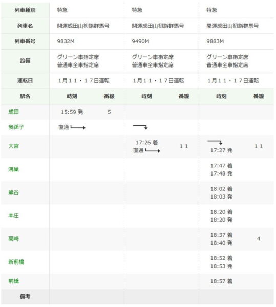 前橋⇔成田「直通」! 群馬県と千葉県を異色ルートで結ぶ特急が運転へ 「我孫子支線」にも入線 読み込み中... 拡大画像 臨時特急「開運成田山初詣群馬号」運転時刻(画像:JR東日本) 拡大画像 臨時特急「開運成田山初詣群馬号」運転時刻(画像:JR東日本) 拡大画像 E653系(画像:写真AC) 関連記事 氷路面も走れる新世代タイヤ「シンクロウェザー」体感レポ 軽で志賀高原へ行ってみた (PR)DUNLOP 「きかんしゃトーマス」の“大親友”が大井川鐵道で運行へ 「黒いSL」を改装 国産トラックのビジュアルも新たなレベル? カッコ良さと仕事目的が交わった新世代トラックとは 現行「フェアレディZ」初の大幅チェンジへ! オートサロンで「NISMO」改良型を先行展示 標準モデルは“顔つき”一新 小田急が「異様にお得なバスツアー」来月開催へ 秦野や厚木エリアの“穴場スポット”を巡る盛りだくさんの内容 この画像の記事を読む