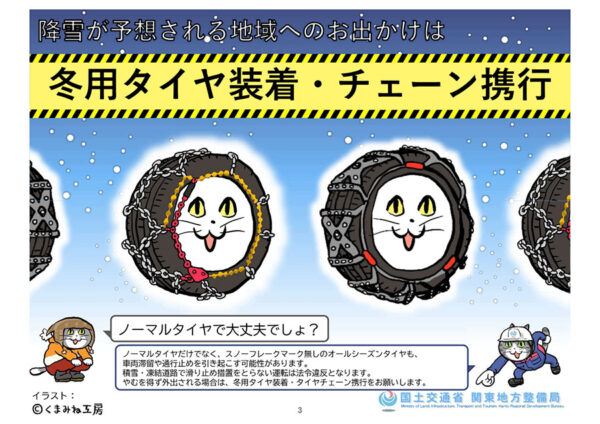 仕事猫ですら真面目に「ヨシ!」冬場は「絶対、スノータイヤやチェーンの装着して!」 楽しい動画で訴える切実な理由とは? 読み込み中... 拡大画像 「仕事猫タイヤ」(国土交通省 関東地方整備局) 拡大画像 冬場の道路利用でのお願い(国土交通省 関東地方整備局) 拡大画像 冬用タイヤの確認をする仕事猫(画像:国土交通省 関東地方整備局) 関連記事 9万8000円で250ccフルカウルスポーツバイクが手に入るってマジ!? (PR)バイク王 県内有数の渋滞ポイント「読めたらスゴい難読交差点」が激変へ!? 拡幅に向け“4方向いつでも左折”廃止へ! 茨城 氷路面も走れる新世代タイヤ「シンクロウェザー」体感レポ 軽で志賀高原へ行ってみた (PR)DUNLOP 警察官じゃない!?「制限速度」を決めているのは誰? 120キロ解禁の裏にある「実勢速度」とは ハマると“壮絶な渋滞”に!? 「冬の関越道」猛烈スキー渋滞を突破する方法 絶対注意の「ここから冬タイヤ規制」 この画像の記事を読む