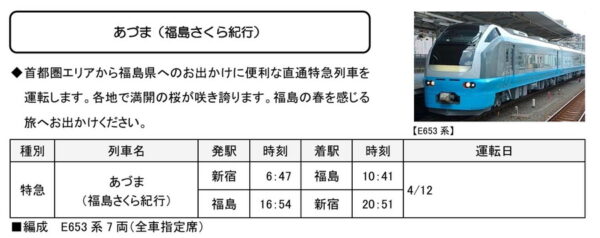 新宿⇔福島「直通」! 首都圏と東北を結ぶ特急が運転へ 所要時間は約4時間 読み込み中... 拡大画像 新宿駅と福島駅を結ぶ特急「あづま(福島さくら紀行)」の運転時刻(画像:JR東日本) 拡大画像 E653系(画像:写真AC) 関連記事 9万8000円で250ccフルカウルスポーツバイクが手に入るってマジ!? (PR)バイク王 近鉄電車に「東武8000系風」の車両が登場! 外装イメージが明らかに 運行区間は? 氷路面も走れる新世代タイヤ「シンクロウェザー」体感レポ 軽で志賀高原へ行ってみた (PR)DUNLOP 「ポムポムプリン」ラッピング電車が登場! ちゃんと“お尻のしるし(*)”付きのポスターもある 西東京の住宅街を貫く「新道路」建設スタート 駅前からズバッと一直線 どこまで通じる? この画像の記事を読む