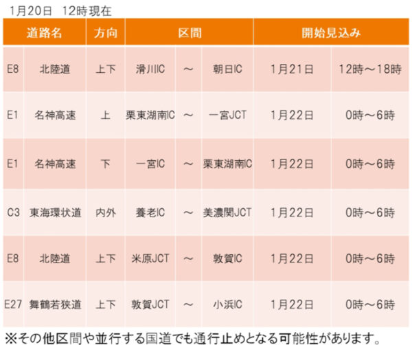 名神&北陸道あすから「通行止めの可能性」明言 一般道は広域マヒの可能性も 「外出控えて」 読み込み中... 拡大画像 NEXCO中日本管内の予防的通行止め可能性区間(画像:NEXCO中日本) 拡大画像 NEXCO西日本管内の予防的通行止め可能性区間(画像:NEXCO中日本) 拡大画像 一般道の通行止め等可能性区間(画像:国土交通省) 拡大画像 1月2日広島呉道路でのスタックの様子(画像:NEXCO西日本) 拡大画像 過去のスタック車両(画像:国土交通省) 拡大画像 1月2日に福井県で発生したスタック車両(画像:国土交通省) 関連記事 9万8000円で250ccフルカウルスポーツバイクが手に入るってマジ!? (PR)バイク王 西東京の住宅街を貫く「新道路」建設スタート 駅前からズバッと一直線 どこまで通じる? 氷路面も走れる新世代タイヤ「シンクロウェザー」体感レポ 軽で志賀高原へ行ってみた (PR)DUNLOP 「横浜のジャンクション駅」に開通した新道に“バス”がデビュー! 団地までの“激セマ道”解消 まずは自動運転バスから 空港近くの「慢性渋滞」解消なるか 国道直上に“ほぼ高速道路”建設へ 福岡で3月着工式 この画像の記事を読む
