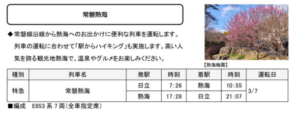 「常磐線から熱海まで直通する列車」が登場! “日立発着”で3月運転 所要時間は3時間半 読み込み中... 拡大画像 臨時特急「常磐熱海」の運行時刻(画像:JR東日本) 拡大画像 E653系(画像:写真AC) 関連記事 【マセラティ】オリジナルプレゼントキャンペーン実施中! (PR)Maserati Japan 1日1本だけの“東京横断”JR特急、3両だと足りない? 目指すは富士山 立ち人ゾロゾロ 9万8000円で250ccフルカウルスポーツバイクが手に入るってマジ!? (PR)バイク王 【アンケート】上京したら「どの路線・駅」に住みたい? どこがオススメ? その理由も教えて! 氷路面も走れる新世代タイヤ「シンクロウェザー」体感レポ 軽で志賀高原へ行ってみた (PR)DUNLOP この画像の記事を読む