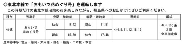 仙台と郡山を結ぶ「気動車の快速」が登場! 国鉄色のキハ110系で運行へ 「レトロラッピング車両」が外装を一新 読み込み中... 拡大画像 快速「おもいで花めぐり号」の運行時刻(画像:JR東日本) 拡大画像 国鉄時代の懐かしい色合いを再現したキハ110系「おもいで車両」のイメージ(画像:JR東日本) 拡大画像 国鉄時代の懐かしい色合いを再現したキハ110系「おもいで車両」のイメージ(画像:JR東日本) 関連記事 【マセラティ】オリジナルプレゼントキャンペーン実施中! (PR)Maserati Japan スイッチバック2回/県都は素通り/残っているのが奇跡!? ナゾの「激レア特急」が面白すぎる! 存続には黄信号 9万8000円で250ccフルカウルスポーツバイクが手に入るってマジ!? (PR)バイク王 「マジで御茶ノ水」海外の“そっくりな景色”がSNSで注目集める 走っている電車に共通点も!? 氷路面も走れる新世代タイヤ「シンクロウェザー」体感レポ 軽で志賀高原へ行ってみた (PR)DUNLOP この画像の記事を読む