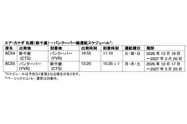 史上初「北海道初の北米直行便」誕生へ 行き先はどこ? 「移動時間が今より2時間以上短くなります」12月より 読み込み中... エアカナダ「新千歳~バンクーバー線」の運航ダイヤ(画像:エアカナダ)。 エアカナダ機(画像:エアカナダ)。 関連記事 【マセラティ】オリジナルプレゼントキャンペーン実施中! (PR)Maserati Japan JALの「朝の3時に現地着」の新路線→まさに“逆転の発想”な驚愕の旅行プランとは なぜそんな時間に着くのか? 9万8000円で250ccフルカウルスポーツバイクが手に入るってマジ!? (PR)バイク王 遠慮はいらない? 乗りもののリクライニング「どこまで倒すか」問題 “100%倒す派”は何割? それぞれの“主張” 氷路面も走れる新世代タイヤ「シンクロウェザー」体感レポ 軽で志賀高原へ行ってみた (PR)DUNLOP この画像の記事を読む