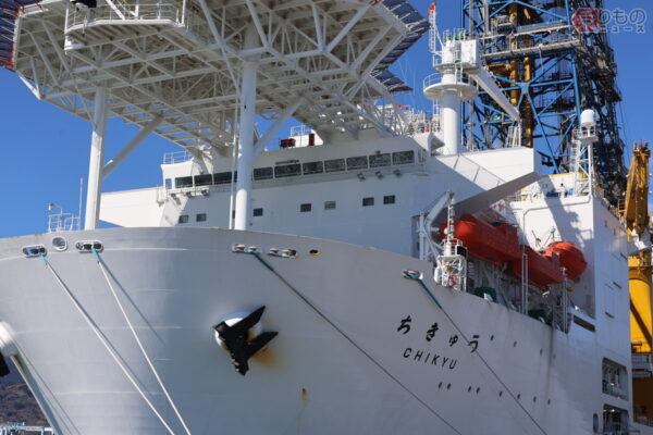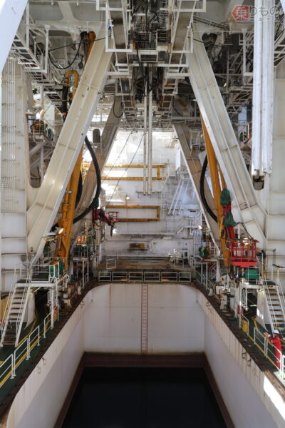 異形の超巨大船 ついに“歴史的偉業”達成!水深6000mから「吸い上げた泥」に日本の命運が…!? 読み込み中... 地球深部探査船「ちきゅう」の全景(画像:JMASTEC)。 地球深部探査船「ちきゅう」のブリッジ(画像:乗りものニュース編集部撮影)。 地球深部探査船「ちきゅう」の掘削やぐら(デリック)(画像:乗りものニュース編集部撮影)。 地球深部探査船「ちきゅう」の掘削やぐらの下(画像:乗りものニュース編集部撮影)。 地球深部探査船「ちきゅう」の掘削フロアの下にある「ムーンプール」(画像:乗りものニュース編集部撮影)。 地球深部探査船「ちきゅう」のブリッジ内部(画像:乗りものニュース編集部撮影)。 掘削用のドリルパイプ(画像:乗りものニュース編集部撮影)。 清水港に停泊するJAMSTECの地球深部探査船「ちきゅう」(乗りものニュース編集部撮影)。 関連記事 【マセラティ】オリジナルプレゼントキャンペーン実施中! (PR)Maserati Japan まるで永田町の「自民党バイパス」!? 未成の都市計画道路、そのまま廃止か? “あとちょっとで拡幅できそう”なのになぜ? 9万8000円で250ccフルカウルスポーツバイクが手に入るってマジ!? (PR)バイク王 「日本一長い地下鉄」さらに延伸へ 来年度の取り組みは? 実現すれば延長約45kmに 氷路面も走れる新世代タイヤ「シンクロウェザー」体感レポ 軽で志賀高原へ行ってみた (PR)DUNLOP この画像の記事を読む