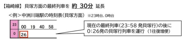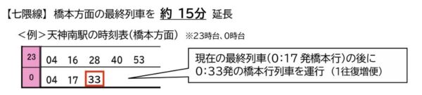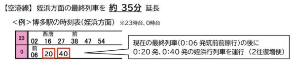 福岡市地下鉄が今春から「ミッドナイト・トレイン」運行! “華金”以外も全線で終電延長へ 読み込み中... 拡大画像 空港線の終電時刻例(画像:福岡市交通局) 拡大画像 箱崎線の終電時刻例(画像:福岡市交通局) 拡大画像 七隈線の終電時刻例(画像:福岡市交通局) 拡大画像 運行間隔(平均)の変更(画像:福岡市交通局) 拡大画像 運行本数(画像:福岡市交通局) 拡大画像 福岡市地下鉄新型車両4000系(画像:福岡市交通局) 拡大画像 福岡市地下鉄の車両(画像:写真AC) 関連記事 【マセラティ】オリジナルプレゼントキャンペーン実施中! (PR)Maserati Japan JR西日本の「必ず座れる列車」新ブランドに統一へ 「Aシート」や「うれしート」はどうなる? 9万8000円で250ccフルカウルスポーツバイクが手に入るってマジ!? (PR)バイク王 東武東上線の「斬新な新車」ついに登場! 走行試験の様子を捉えた映像が公開 はるばる山口県から首都圏へ 氷路面も走れる新世代タイヤ「シンクロウェザー」体感レポ 軽で志賀高原へ行ってみた (PR)DUNLOP この画像の記事を読む