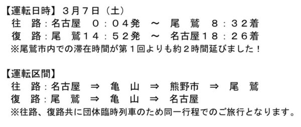 愛知県と三重県を結ぶ「夜行列車」が運行へ 8時間以上かけて最新ハイブリッド特急車両が走る! 読み込み中... 拡大画像 三重県尾鷲市の名物朝市「尾鷲イタダキ市」に向けた夜行列車の運行時刻(画像:JR東海) 拡大画像 HC85系(画像:写真AC) 関連記事 【マセラティ】オリジナルプレゼントキャンペーン実施中! (PR)Maserati Japan 東京近郊の住みたい路線・駅は?「都心に近い」けど「都会過ぎない」丁度よい人気エリアとは 9万8000円で250ccフルカウルスポーツバイクが手に入るってマジ!? (PR)バイク王 【アンケート】駅に着いたら「電車止まってる」「大幅に遅延してる」そのときどうする? 対処法を教えて! 氷路面も走れる新世代タイヤ「シンクロウェザー」体感レポ 軽で志賀高原へ行ってみた (PR)DUNLOP この画像の記事を読む