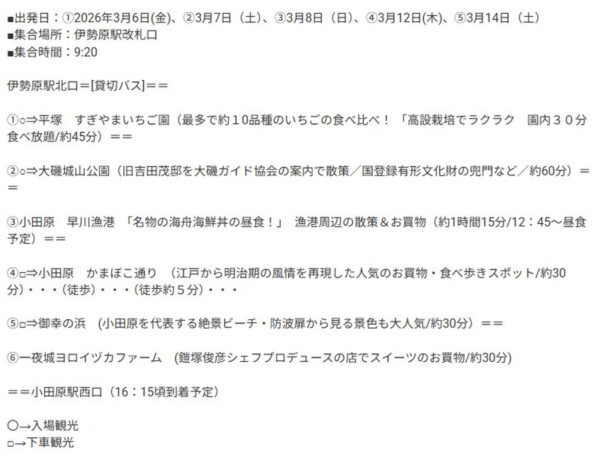 小田急が3月に「異様にお得なバスツアー」開催へ 小田原や平塚の“穴場スポット”を巡る盛りだくさんの内容 読み込み中... 拡大画像 「お得に旅する神奈川日帰りバスツアー第3弾」の行程(画像:小田急電鉄) 拡大画像 「お得に旅する神奈川日帰りバスツアー第3弾」のイメージ(画像:写真AC) 関連記事 【マセラティ】オリジナルプレゼントキャンペーン実施中! (PR)Maserati Japan 地上とトンネルで「2×2車線」横浜の住宅街でいよいよ工事本格化 激セマ&急坂道に代わる「横浜逗子線」トンネル掘削着手へ 9万8000円で250ccフルカウルスポーツバイクが手に入るってマジ!? (PR)バイク王 小田急の「赤い通勤電車」を運転可能! 本格的すぎる体験イベントが3月に開催へ 海老名車両基地で 氷路面も走れる新世代タイヤ「シンクロウェザー」体感レポ 軽で志賀高原へ行ってみた (PR)DUNLOP この画像の記事を読む