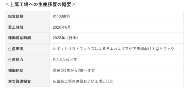 いすゞ「神奈川・藤沢での大型トラック生産」終了へ! 新工場は埼玉・上尾 再編の狙いは? 読み込み中... 上尾工場に建設される新塗装工場のイメージ(画像:いすゞ)。 拡大画像 藤沢工場と上尾工場の概要(画像:いすゞ)。 拡大画像 上尾工場への生産移管の概要(画像:いすゞ)。 大型トラックの旗艦拠点となる上尾工場(画像:いすゞ)。 拡大画像 いすゞのベストセラートラック「エルフ」(画像:いすゞ)。 拡大画像 いすゞの大型トラック「ギガ」(画像:いすゞ)。 拡大画像 いすゞの大型トラック「ギガ」(画像:いすゞ)。 関連記事 【マセラティ】オリジナルプレゼントキャンペーン実施中! (PR)Maserati Japan 航行中のフェリーが「海自のイージス艦」に遭遇!? 外観の特徴を捉えた見事なショットが公開 9万8000円で250ccフルカウルスポーツバイクが手に入るってマジ!? (PR)バイク王 「新宿駅から新潟県まで直通する特急」が今月運転! 池袋や大宮にも停車 三セク路線に乗り入れ 氷路面も走れる新世代タイヤ「シンクロウェザー」体感レポ 軽で志賀高原へ行ってみた (PR)DUNLOP この画像の記事を読む