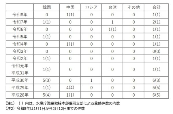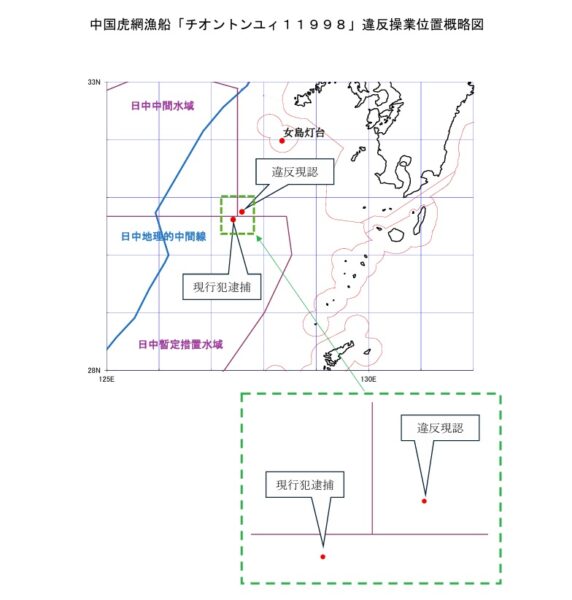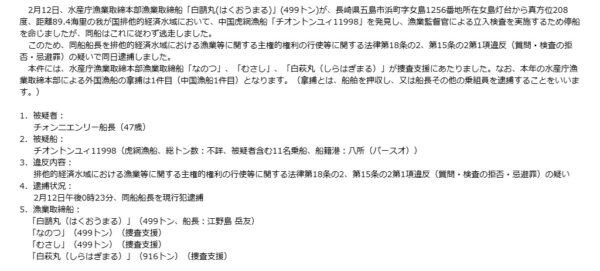 水産庁が「違法な中国漁船」を拿捕・船長逮捕! 根こそぎ取る「海の掃除機」なる漁法とは 読み込み中... 拡大画像 水産庁漁業取締本部漁業取締船「白鴎丸」(左)と中国虎網漁船「チオントンユィ11998」(右)(画像:水産庁)。 拡大画像 中国虎網漁船「チオントンユィ11998」の違法操業位置概略図(画像:水産庁)。 拡大画像 違法な虎網漁法の概略(画像:水産庁) 拡大画像 2026年2月12日に水産庁の漁業取締船が拿捕、同日付で逮捕された中国人船長の詳細と違反内容(画像:水産庁) 拡大画像 水産庁漁業取締本部による外国漁船の拿捕(逮捕を含む)件数の推移(画像:水産庁) 拡大画像 水産庁の漁業取締船「白鴎丸」(画像:水産庁)。 関連記事 【マセラティ】オリジナルプレゼントキャンペーン実施中! (PR)Maserati Japan 潜水艦に「くっついて移動する」!? 米大手企業が“コバンザメ無人艇”新発表 これ一つで「魚雷もドローンも撃てます」 9万8000円で250ccフルカウルスポーツバイクが手に入るってマジ!? (PR)バイク王 米軍の「異形の軍艦」と「退役目前の人気機」が奇跡のコラボ「うわ、そんなに低く飛ぶの!?」 氷路面も走れる新世代タイヤ「シンクロウェザー」体感レポ 軽で志賀高原へ行ってみた (PR)DUNLOP この画像の記事を読む
