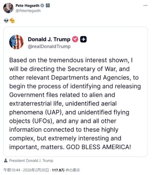 元大統領「宇宙人は存在する」→トランプ氏「全記録を公開しなさい!」指示 何が出てくる? 読み込み中... 拡大画像 トランプ大統領のSNSでの投稿にエイリアンの絵文字で回答するヘグセス国防長官(画像:ヘグセス国防長官公式X)。 米海軍航空システムコマンドの公式ページで公開されている動画のひとつ「FLIR」より。中央の白いものが、正体不明の「何か」(画像:アメリカ海軍)。 米海軍航空システムコマンドの公式ページで公開されている動画のひとつ「GIMBAL」より。「何か」が雲海の上を移動しているように見える(画像:アメリカ海軍)。 米海軍航空システムコマンドの公式ページで公開されている動画のひとつ「GOFAST」より。中央の白い点が急加速し超高速で画面左方向へ消え去る(画像:アメリカ海軍)。 「UFO」こと未確認飛行物体のイメージ(画像:写真AC)。 関連記事 ファン必見!「バリバリ伝説」ポスター広告が新宿駅に登場 (PR)バイク王 これからの給油機は「自らの力で機体を守ります」攻撃する側の技術発展に対応するため“物理的手段で守れ”を強化? 本間ゴルフ・小川社長が語る“変革の真意” 「TW777」が示す挑戦の第一歩 (PR)本間ゴルフ ロシア軍の「異形機」を撃破か 背後から攻撃する瞬間をウクライナが公開 カモメが翼を広げたような外観 なぜゼクシオは売れ続けているのか (PR)ダンロップスポーツマーケティング この画像の記事を読む