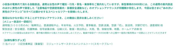 小田急線の車内で流れる「シブ~い声の自動放送」を全公開! 3月に異色の列車が海老名車両基地から運行 読み込み中... 拡大画像 「5000形で流れるあの渋い?男性自動アナウンス全公開スペシャルツアー」(画像:小田急電鉄) 拡大画像 「5000形で流れるあの渋い?男性自動アナウンス全公開スペシャルツアー」(画像:小田急電鉄) 拡大画像 「5000形で流れるあの渋い?男性自動アナウンス全公開スペシャルツアー」(画像:小田急電鉄) 拡大画像 5000形(画像:PIXTA) 関連記事 ファン必見!「バリバリ伝説」ポスター広告が新宿駅に登場 (PR)バイク王 JR東海「最後の国鉄」電車が引退へ “同時期の兄弟”と何が違う? 40年近い歴史に幕は…閉じない! 本間ゴルフ・小川社長が語る“変革の真意” 「TW777」が示す挑戦の第一歩 (PR)本間ゴルフ 5時間20分も走るロマンスカーが運転される 成城学園前→片瀬江ノ島を“超遠回り” 通常は1時間弱 なぜゼクシオは売れ続けているのか (PR)ダンロップスポーツマーケティング この画像の記事を読む