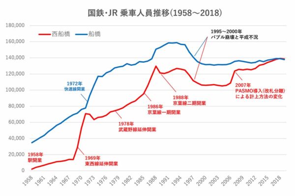 快速通過でも「7年連続」No.1! 千葉で利用者数トップを誇る総武線駅はなぜ「覚醒」したか 下剋上の半世紀 読み込み中... 拡大画像 1967年当時の船橋駅・西船橋駅周辺地図(画像:「今昔マップ on the web」より筆者加工) 拡大画像 現在の船橋駅・西船橋駅周辺地図(画像:国土地理院「地理院地図」より筆者加工) 拡大画像 船橋駅と西船橋駅の乗車人員推移(筆者作成) JR総武線各駅停車(画像:写真AC) JR総武線快速(画像:PIXTA) 関連記事 1tの塩!? 首都高の雪対策、ガチすぎて言葉を失った件 (PR)首都高速道路 東武の珍列車「新型車両ミックス編成」デビュー! 5両のうち1両だけ“ちょい古” まるで間違い探し!? ファン必見!「バリバリ伝説」ポスター広告が新宿駅に登場 (PR)バイク王 JR東日本「大幅値上げ」後の運賃どうなる? 総武線のライバル「京成・メトロ・都営」と比較 山手線は安さ崩壊か 延長2.2kmの「日本一短い鉄道」に異変 1編成だけの保有車両が3月末に運行終了へ 記念ヘッドマークも掲出 この画像の記事を読む