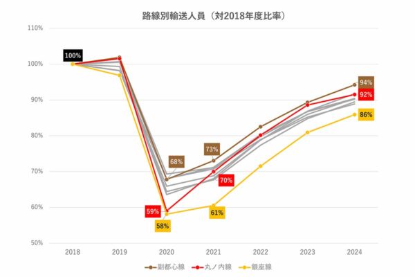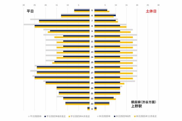 電車の本数、なぜ「朝ラッシュ時だけ」戻らないのか? “コロナ後”も増やしにくい二つの制約 読み込み中... 拡大画像 東京メトロ銀座線上野駅(渋谷方面)の平日・土休日における運行本数の比較(筆者作成) 拡大画像 東京メトロの路線別輸送人員の推移(対2018年度比率)。銀座線は他路線に比べて回復が遅れている(筆者作成) 拡大画像 東京メトロ銀座線(画像:写真AC) 関連記事 1tの塩!? 首都高の雪対策、ガチすぎて言葉を失った件 (PR)首都高速道路 ドクターイエロー引退の裏側 なぜ“専用車がない方が安全”なのか? ド派手なボディ色の意味と新幹線の未来 「タイタニック観たのもここ」「ショックすぎる…」 横浜「相鉄ムービル」再開発で閉館へ 37年の歴史に惜しむ声 駅をスっ飛ばす「地下鉄の快速運転」いちばん便利な路線とは!? 「快速いらない」の声も多数 両者の言い分は? 新型「レオライナー」のデビュー日決定! あれ、その日って…? 大手私鉄唯一の車両「41年ぶりの新型」 この画像の記事を読む
