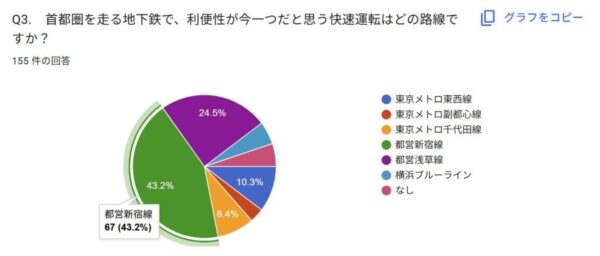 駅をスっ飛ばす「地下鉄の快速運転」いちばん便利な路線とは!? 「快速いらない」の声も多数 両者の言い分は? 読み込み中... 拡大画像 「便利だと思う快速運転」アンケート結果 拡大画像 「利便性が今一つだと思う快速運転」アンケート結果 拡大画像 回答者の性別 拡大画像 回答者の年齢 拡大画像 回答者の居住地 拡大画像 東京メトロ副都心線の車両(画像:写真AC) 拡大画像 都営新宿線の車両(画像:写真AC) 関連記事 1tの塩!? 首都高の雪対策、ガチすぎて言葉を失った件 (PR)首都高速道路 「タイタニック観たのもここ」「ショックすぎる…」 横浜「相鉄ムービル」再開発で閉館へ 37年の歴史に惜しむ声 新型「レオライナー」のデビュー日決定! あれ、その日って…? 大手私鉄唯一の車両「41年ぶりの新型」 本物の「きかんしゃパーシー」ついにお披露目 トーマスの世界が現実に! 貴重なSLが大変身 江戸時代に年間20万人も参加した旅行ブームを体験! 小田急「もころん」のデジタルスタンプラリーが開催中 この画像の記事を読む