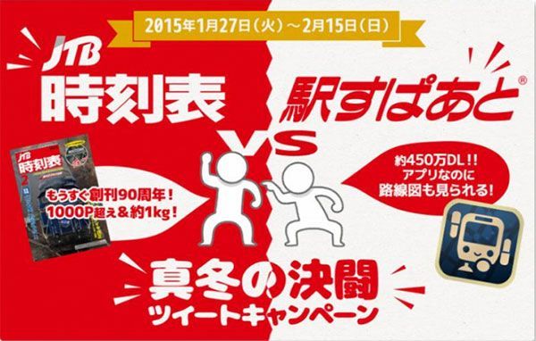 「JTB時刻表 vs 駅すぱあと 真冬の決闘ツイートキャンペーン」と題されたこのイベントは、2015年1月27日(火)から2月15日(日)の23時59分まで実施。「駅すぱあと」「JTB時刻表」という2単語を含め、「#レールブック」というハッシュタグをつけてTwitterへ投稿することにより「真冬の決闘」に参加できます。