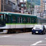 全長66mの路面電車が走るのは、京阪京津線です。この路線は京都市山科区の御陵駅から滋賀県大津市のびわ湖浜大津駅までを結んでおり、その途中の上栄町~びわ湖浜大津間(約500m)は併用軌道となっています。すなわち、この部分が車道上を電車が走る区間で、ここでは長大編成が自動車と並走する光景が見られます。