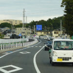 開通した宮上横山線は2車線で、緩やかにS字カーブを描いて高低差のある土地を貫いています。両側に自転車通行帯が備わり幅員は広く、見通しもよい道です。670mの新規開通区間を抜け、東橋本二丁目交差点からが既存開通部です。