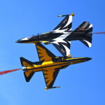 白と赤の塗装の機体が、オリジナルの T-50 です。本機は学生パイロットの高等訓練を目的に設計された純粋な練習機で、アフターバーナー付きのF404系ターボファン・エンジンとフライ・バイ・ワイヤを備え、最大約8Gの機動飛行が可能です。