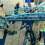 その現橋の3連アーチは、2025年5月、並行して新設された橋脚の上に横スライドして移設され、人道橋として開通しています。本橋の新設工事がいよいよ本格化します。