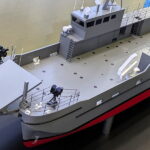 公表されたスペックによると、船体サイズは全長約35m、幅約8m、深さ1.5mで、基準排水量は200t 。乗員は約10名、速力は18ノット(約33.3km/h)とされています。2025年5月に開催された防衛装備展示会「DSEI Japan 2025」にて、JMU(ジャパン・マリン・ユナイテッド)が展示した模型のスペック(全長約30m、20ノット以上)と比較すると、より大型化し実戦的な調整が加えられたことが伺えます。